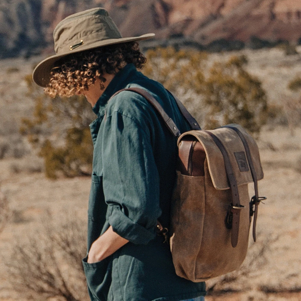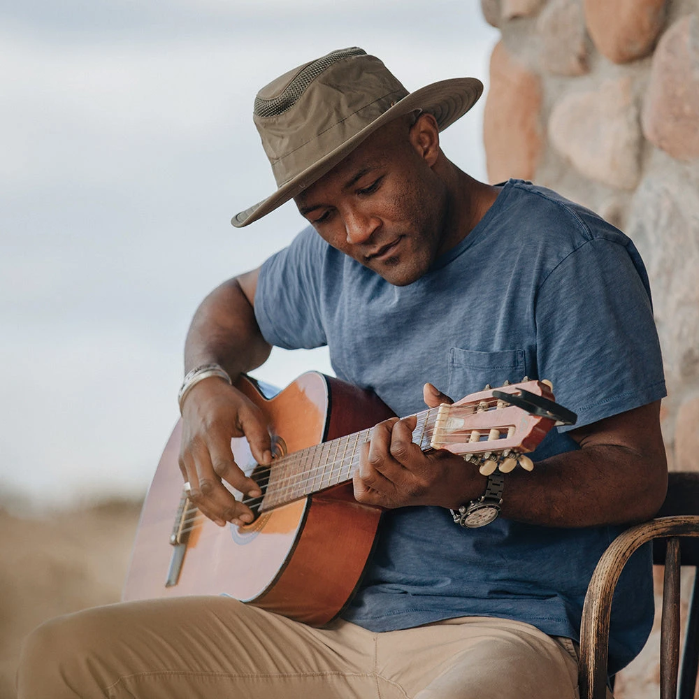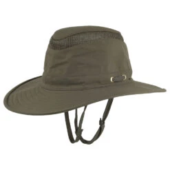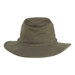 The Tilley LTM6 Airflo Packable Sun Hat in olive is constructed of a durable, water resistant, lightweight and fast drying fabric. Each stitch is lock-stitched, and the poly-cotton thread swells when wet, sealing the needle holes against the rain. Offers UPF50+ sun protection. Airflo Hats incorporate mesh in the crown for extra breathability in hot conditions.