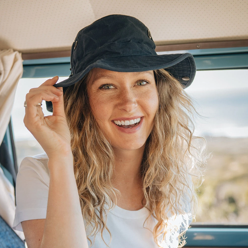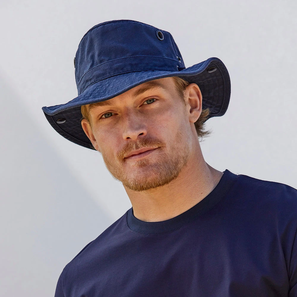 The Tilley T3 Wanderer in navy blue is a classic cotton duck canvas hat suited for the great outdoors. This hat repels water and blocks UV rays. The sides of the brim can be held up against the crown with metal press studs. An adjustable chin cord ensures it always stays safely on your head.