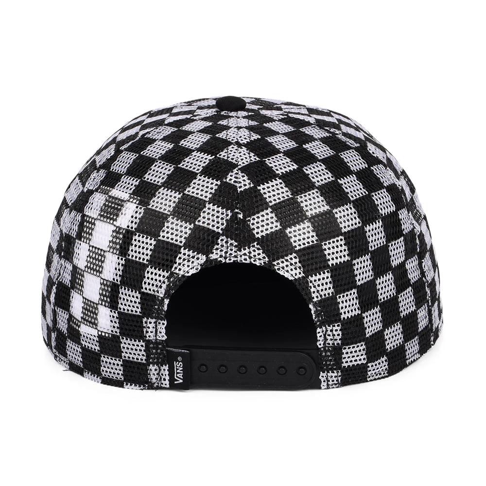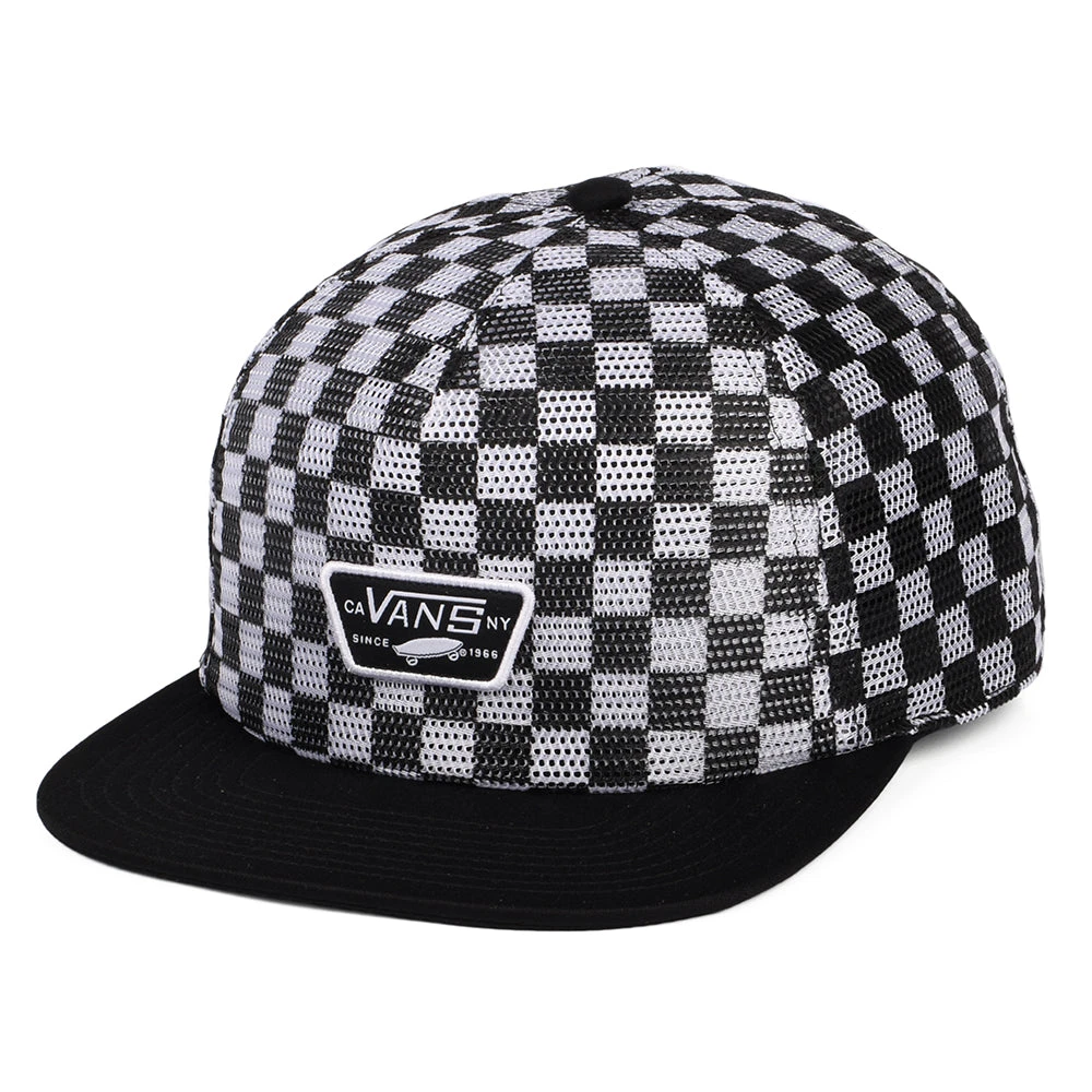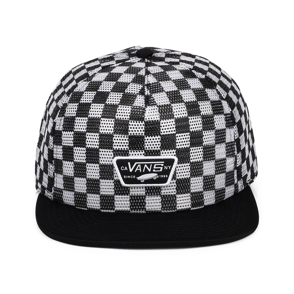 The Vans Hats Full Patch Check Mesh Trucker Cap in black-white is a unique trucker cap featuring a full mesh crown with the classic Vans check pattern. A Vans patch is sewn on the front and a Vans flip tag can be found next to the adjustable snap at the back.